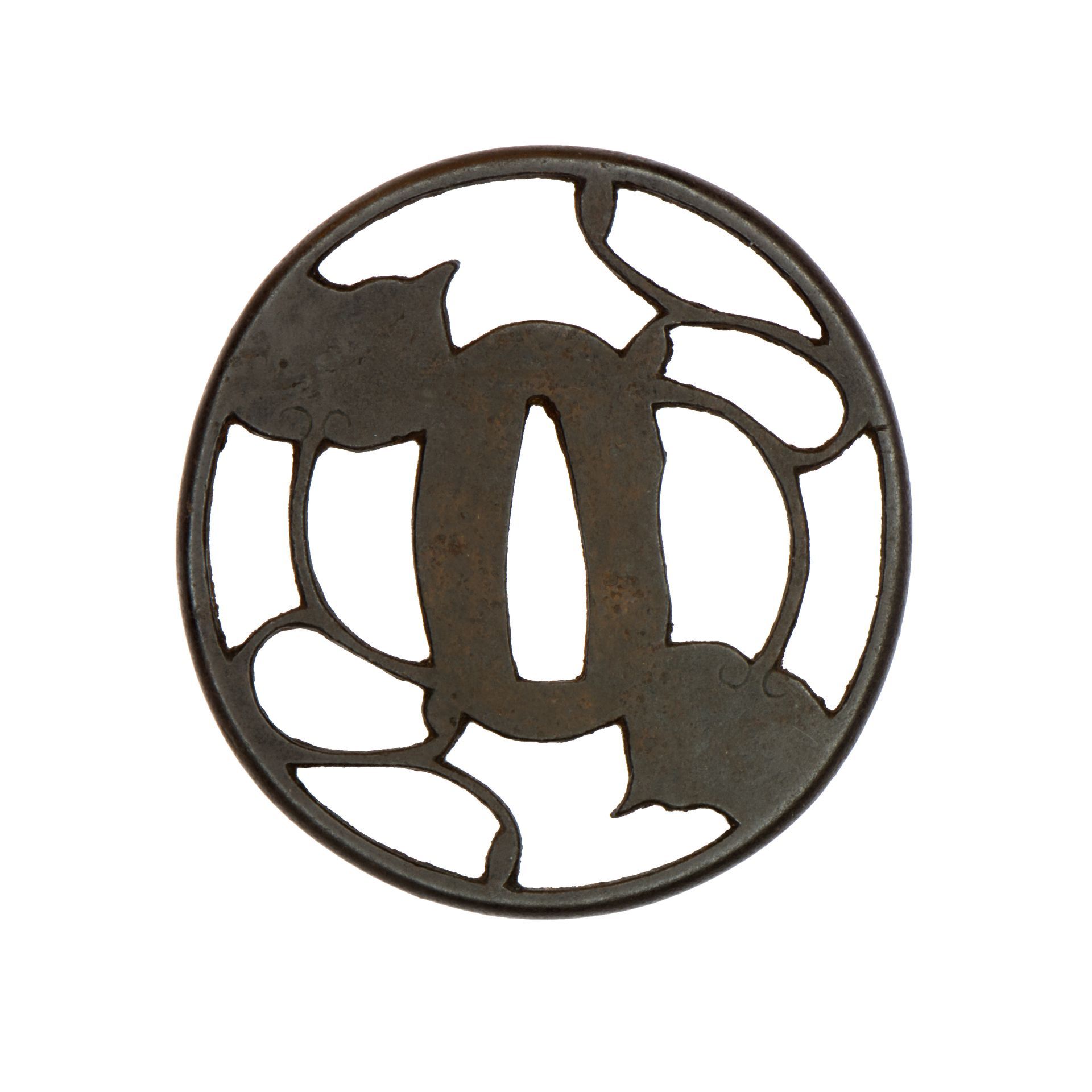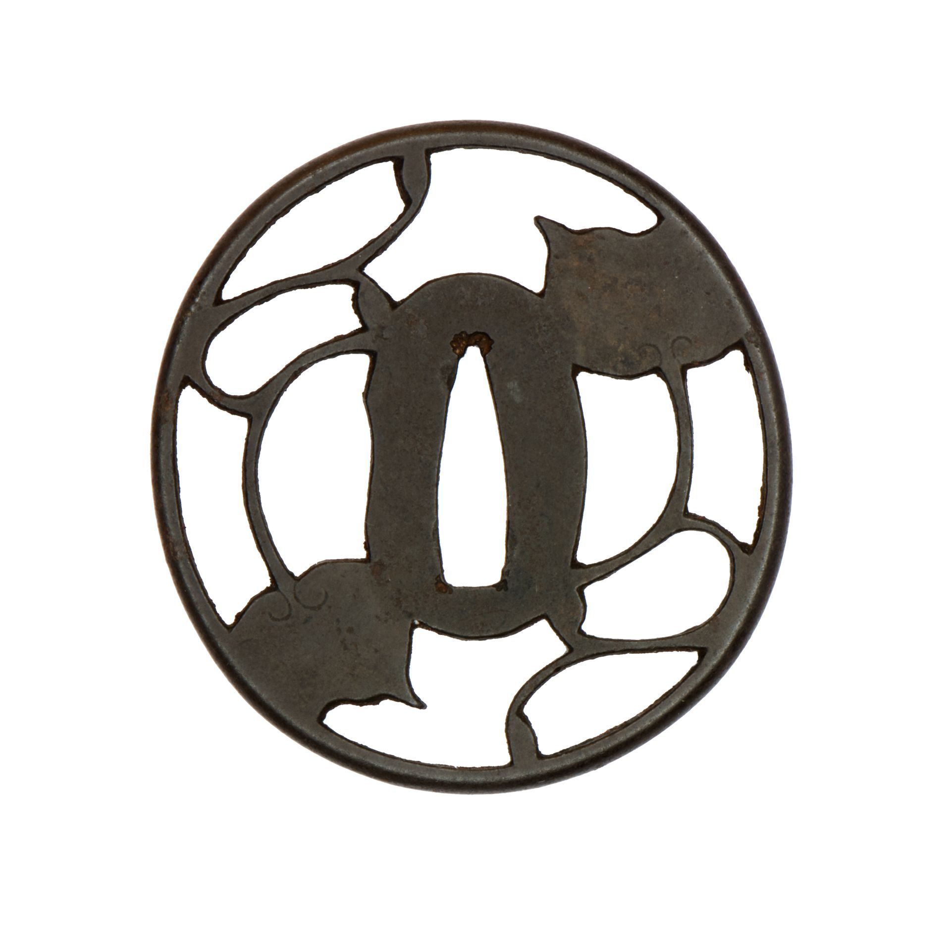 The Tsuba is made in "Sukashi" technique. The motive representing two Sukashi-Style Leaves. The patination and color of steel is excellent typical for these early authentic historic pieces.