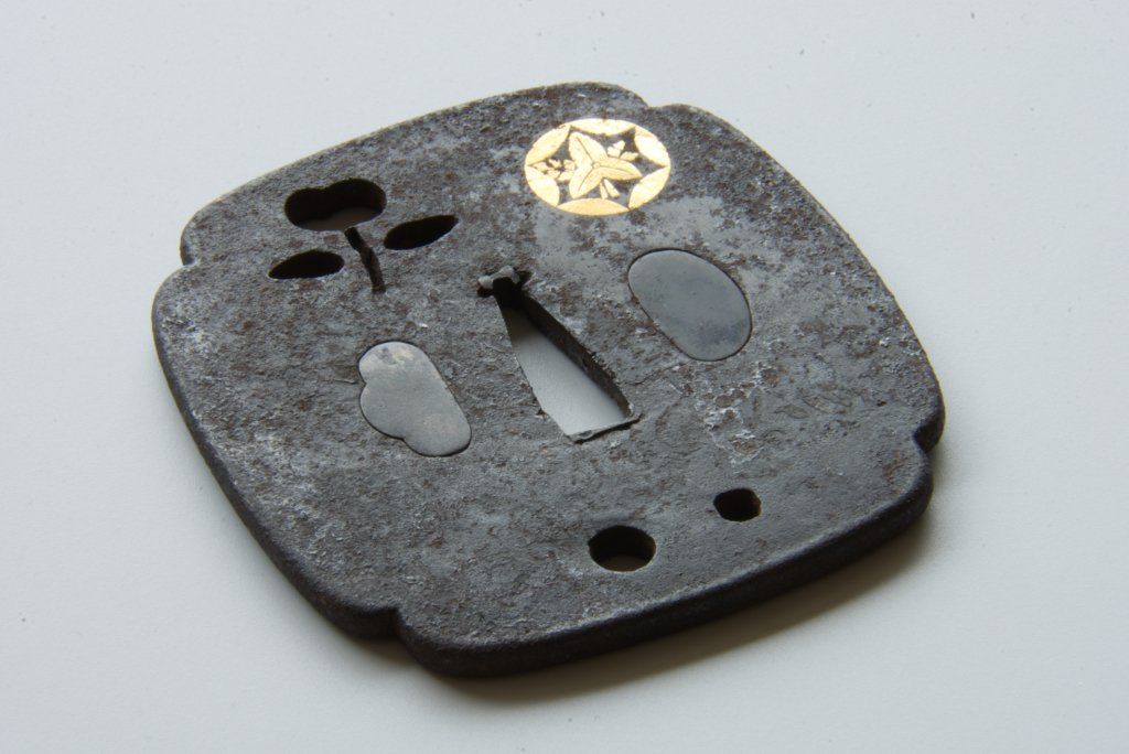 Sukashi Flower, Family mon in Gold inlay. The two hitsuana are carefully closed for preservation. When you look closer there is residue of black laquer present on the surface. Probably the item was painted black originally.