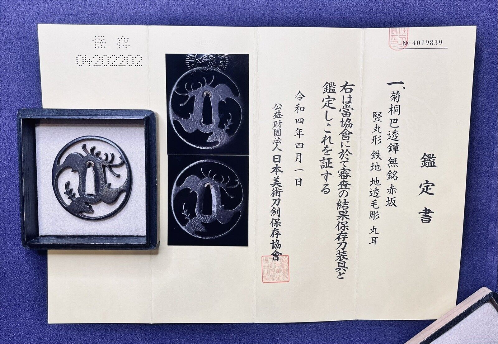 This is a superbly crafted tsuba from the Akasaka school. Attached is the certificate with the rating Hozon - worth preserving from the NBTHK from Tokyo. The certificate is real.