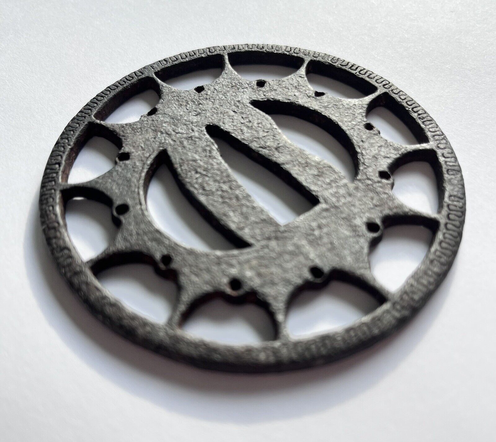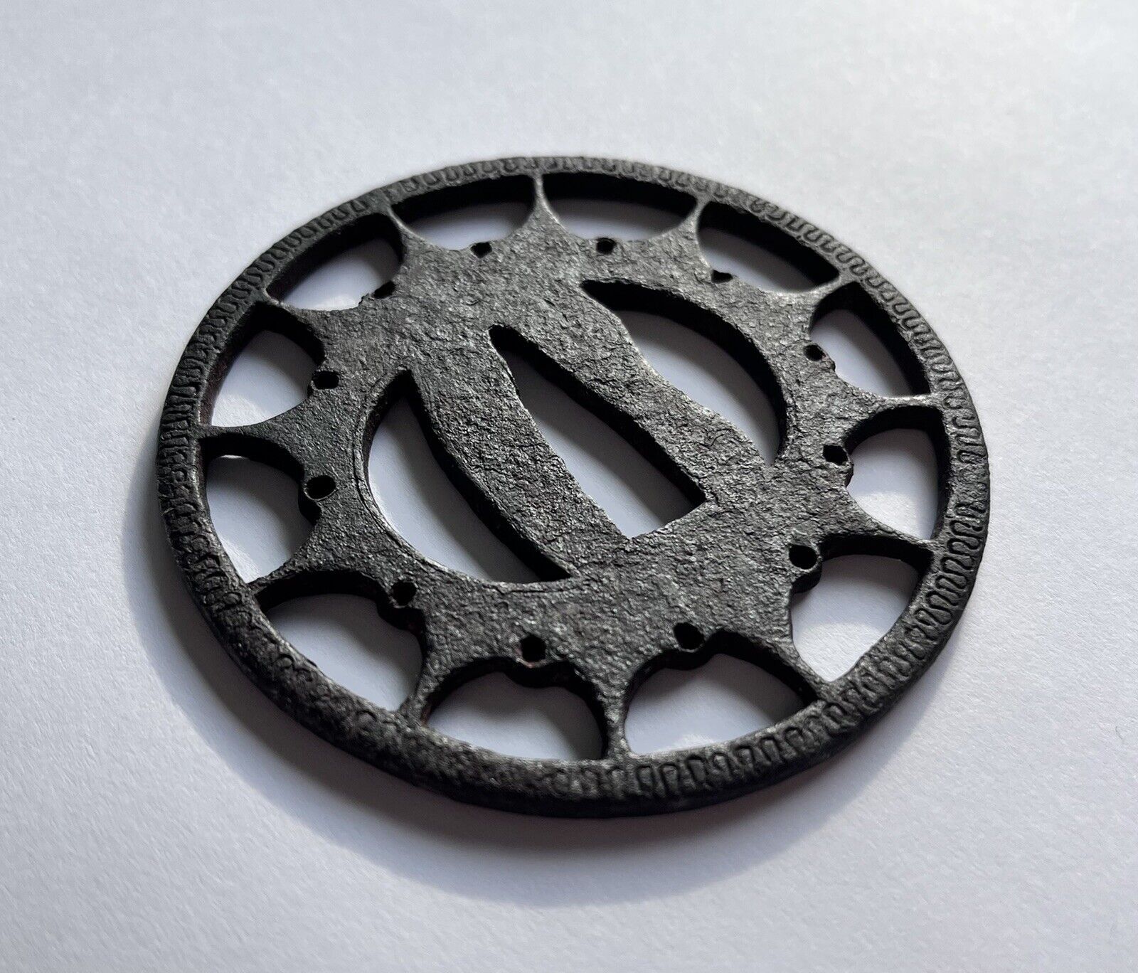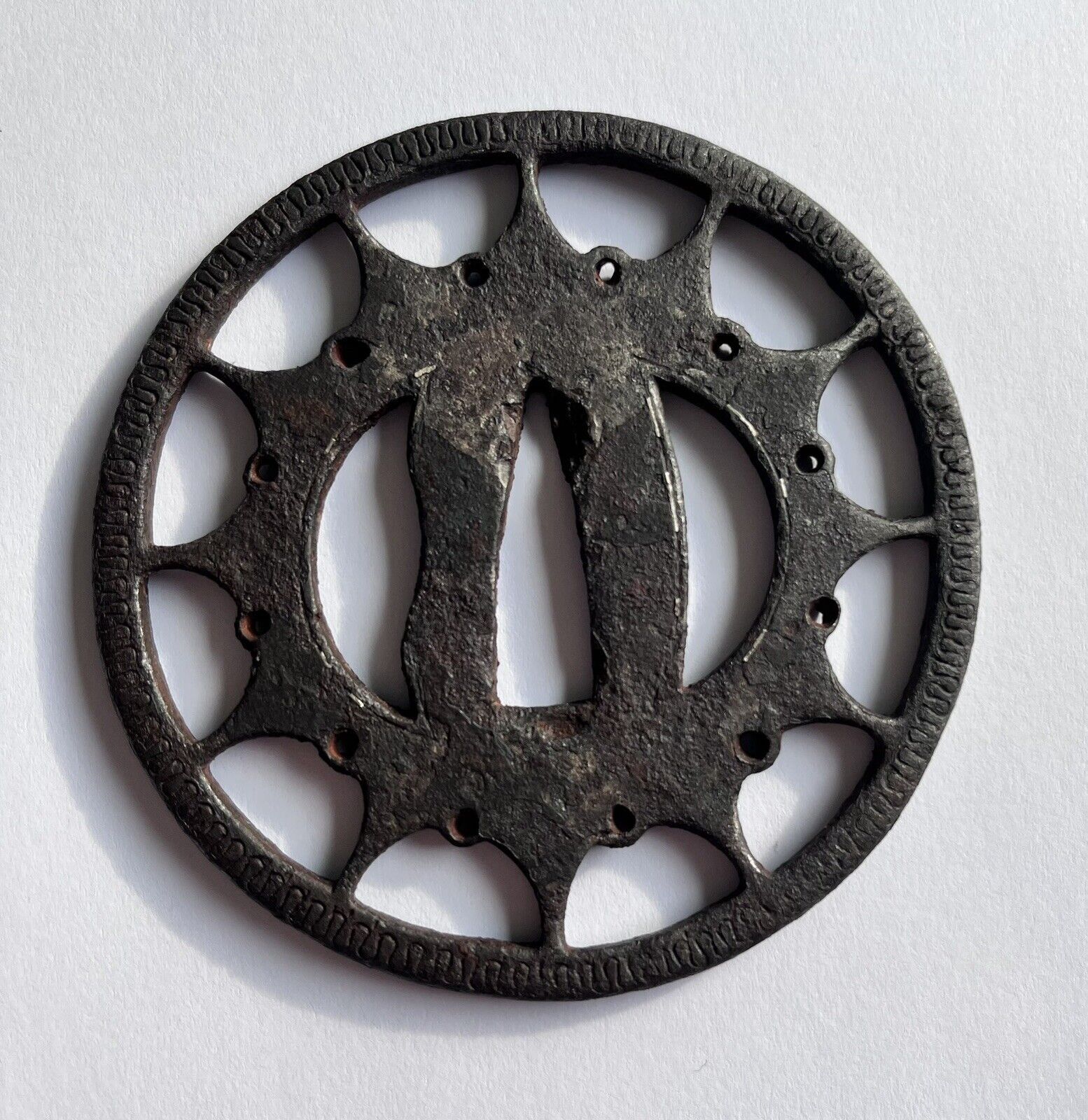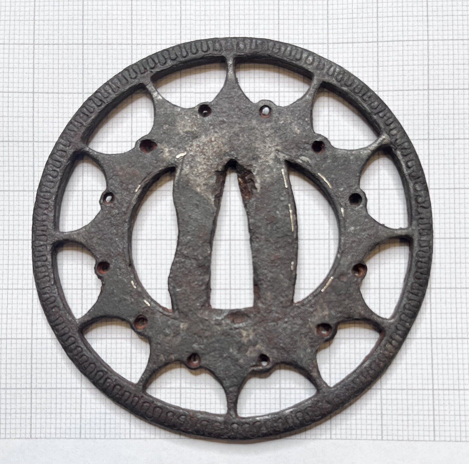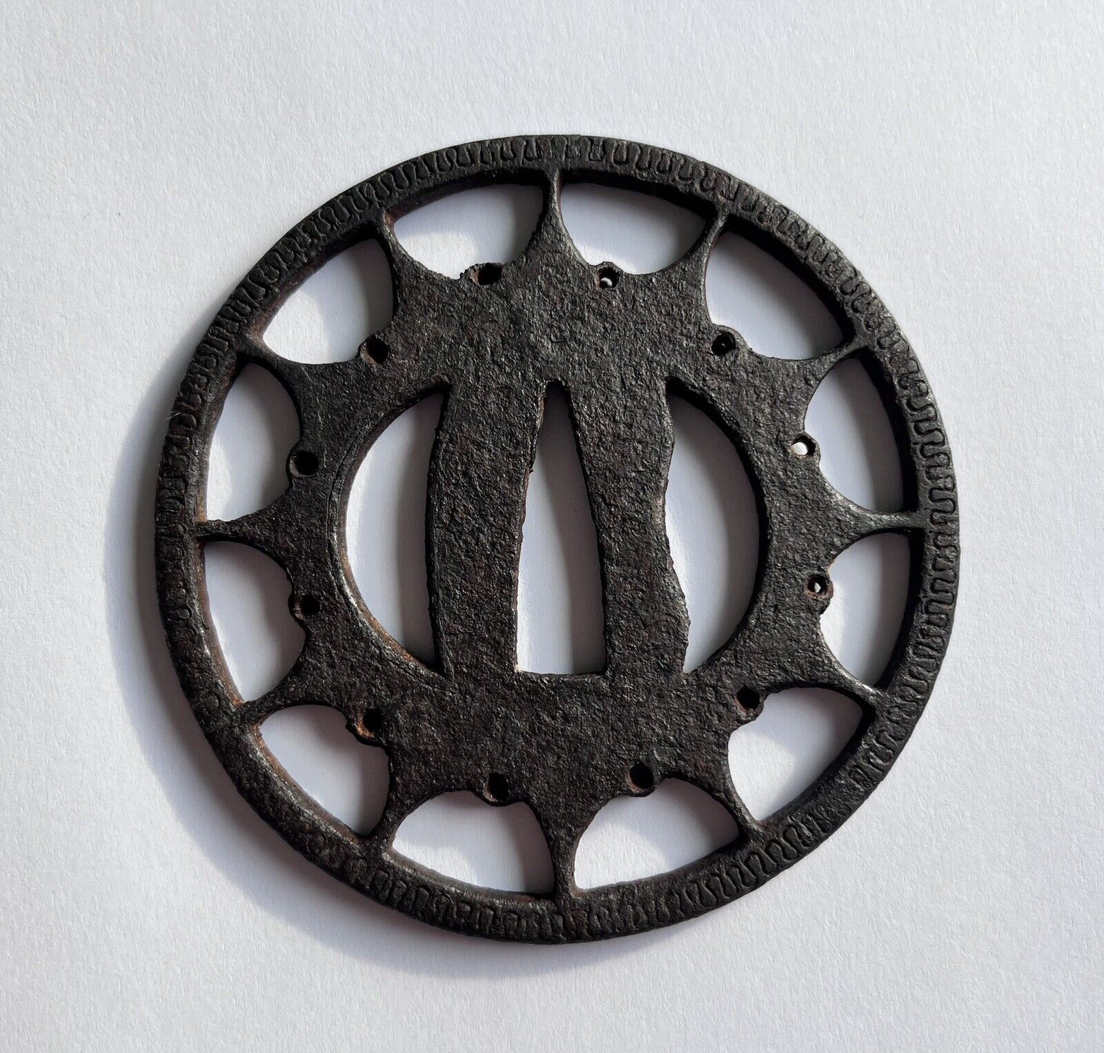 Shown is the Buddhist wheel Rinpo. A very typical early tsuba. Due to the silver inlay work and the overall very rudimentary appearance, the surface and thickness, this style is attributed to the time when the early armor makers - called Ko-Katchushi - were active.