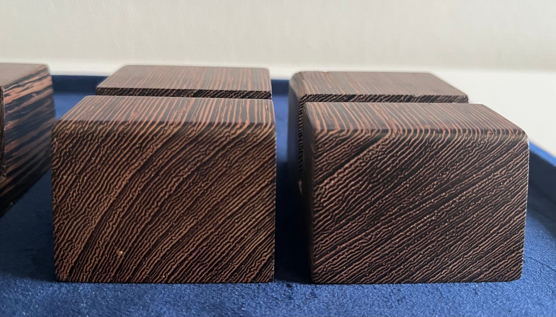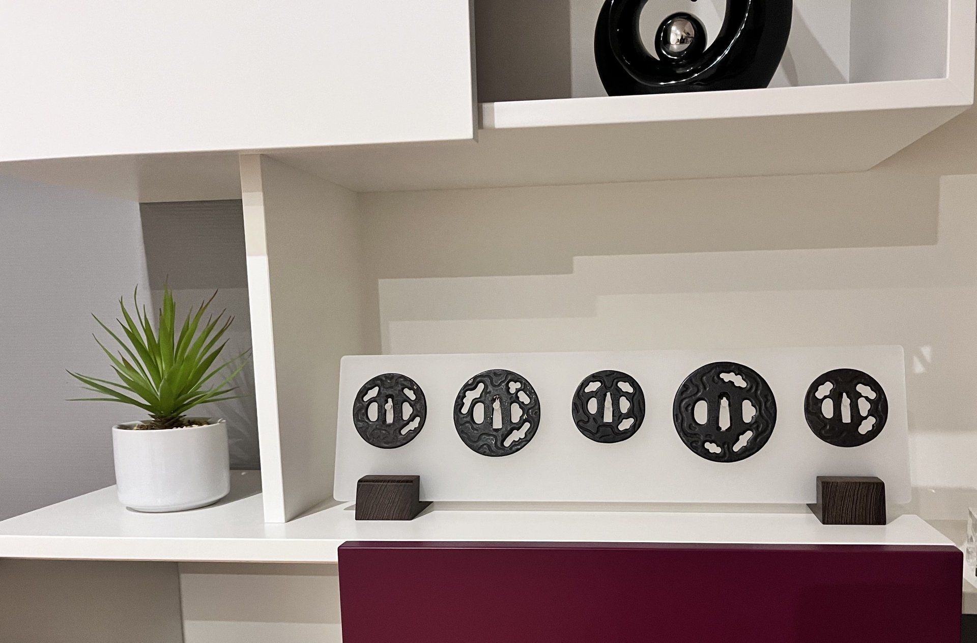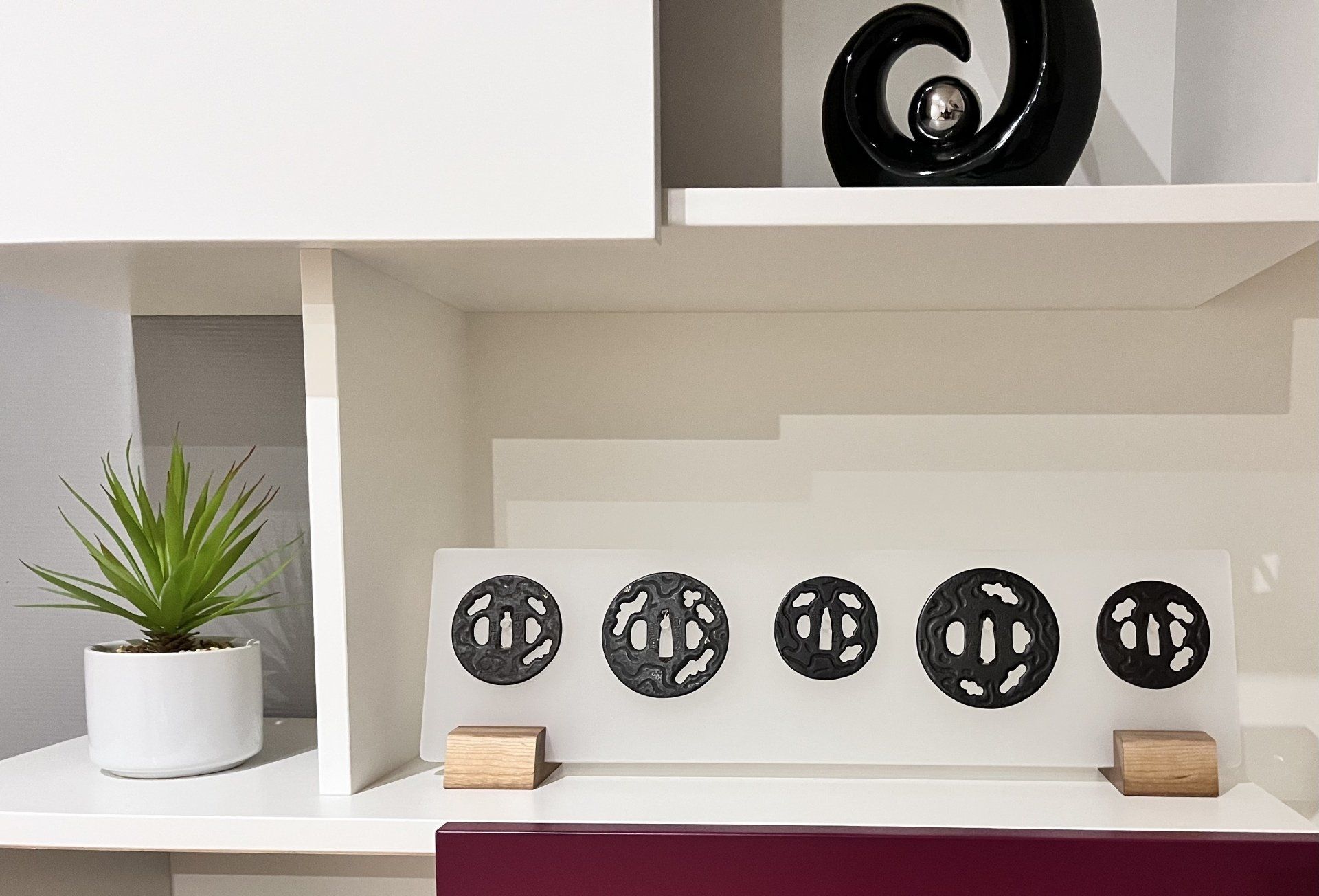These Stands fit 5 Tsuba. Available only in a opaque matte design. The wooden base is movable. This verison is made by wenge wood. 100% handmade in France.
