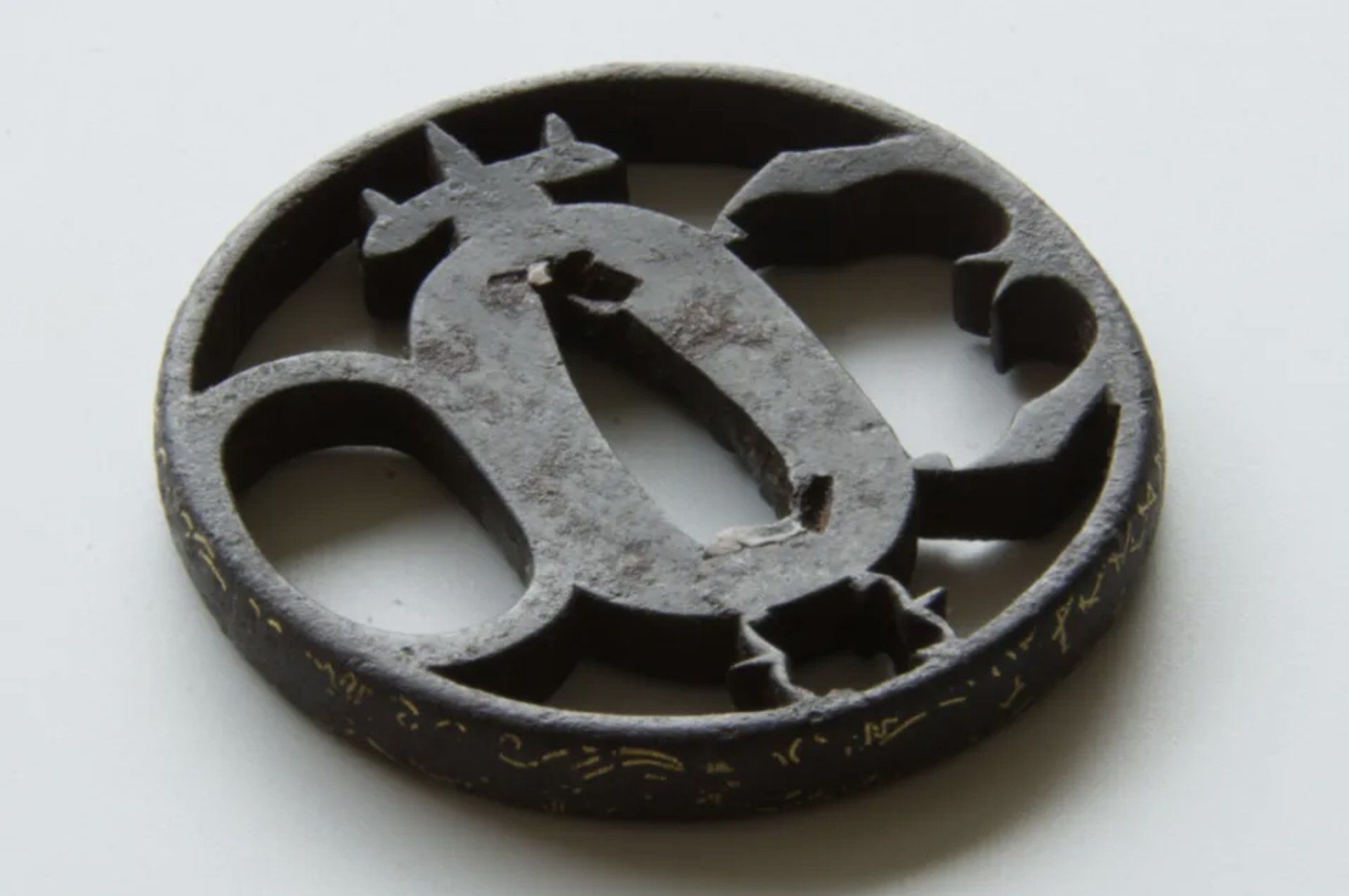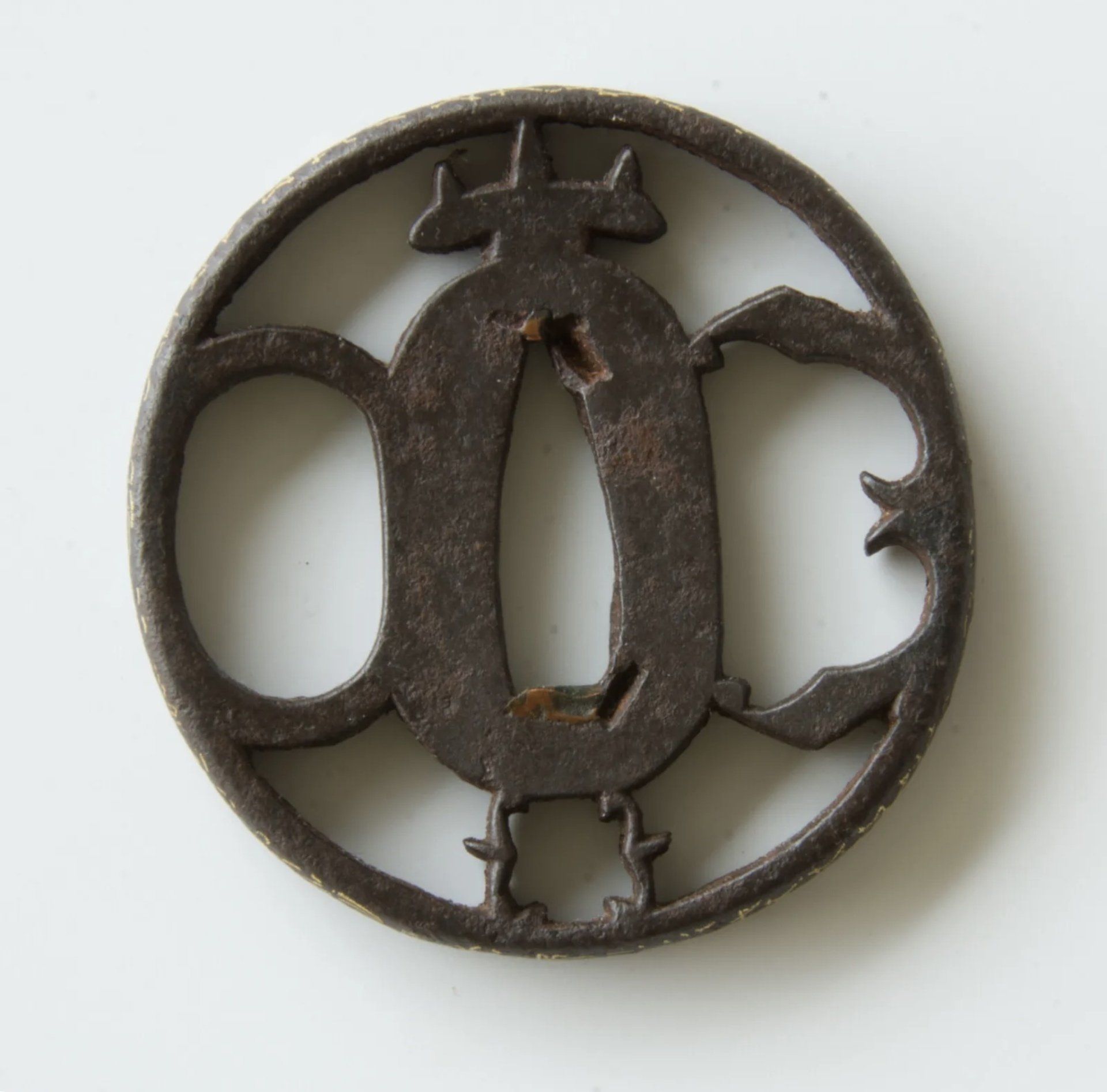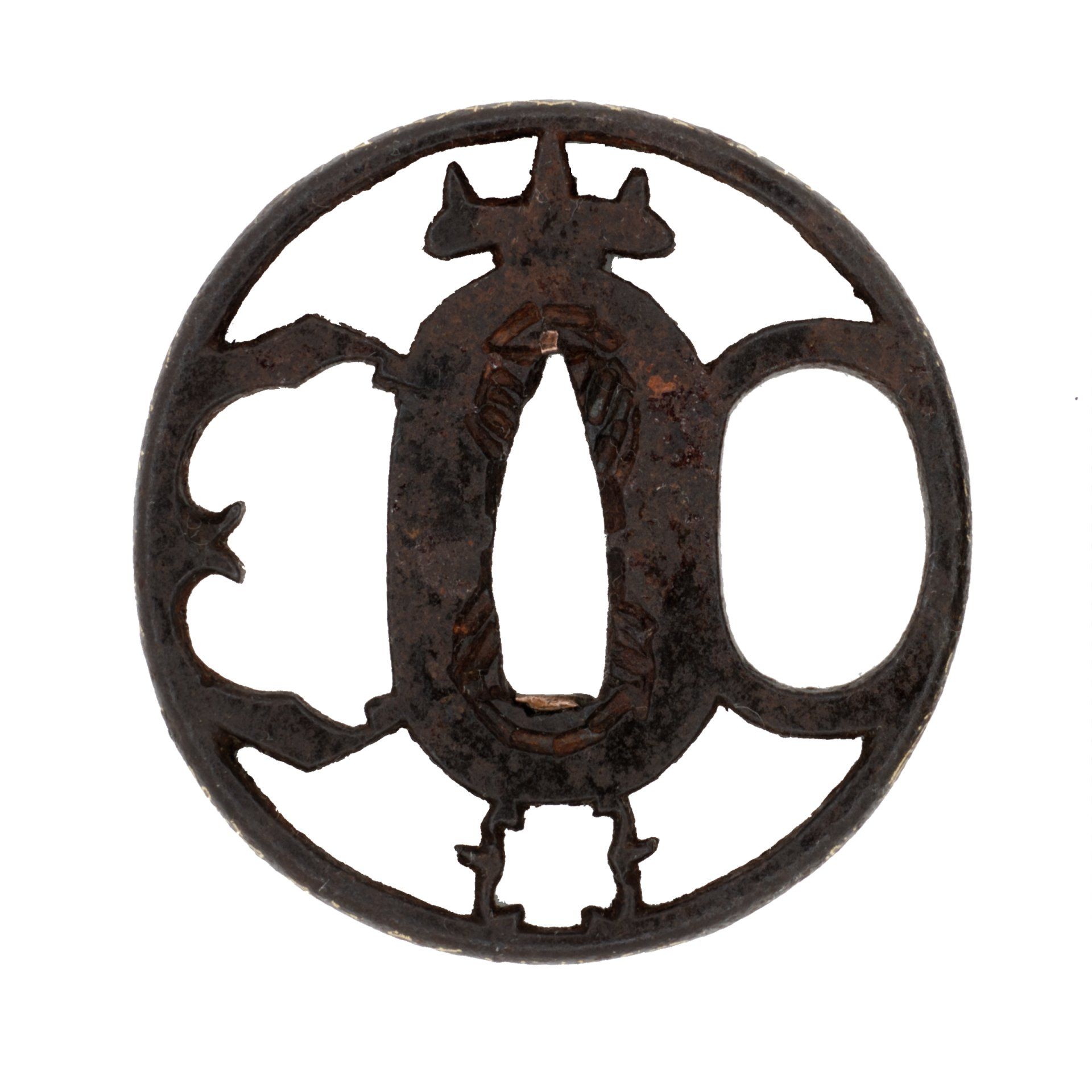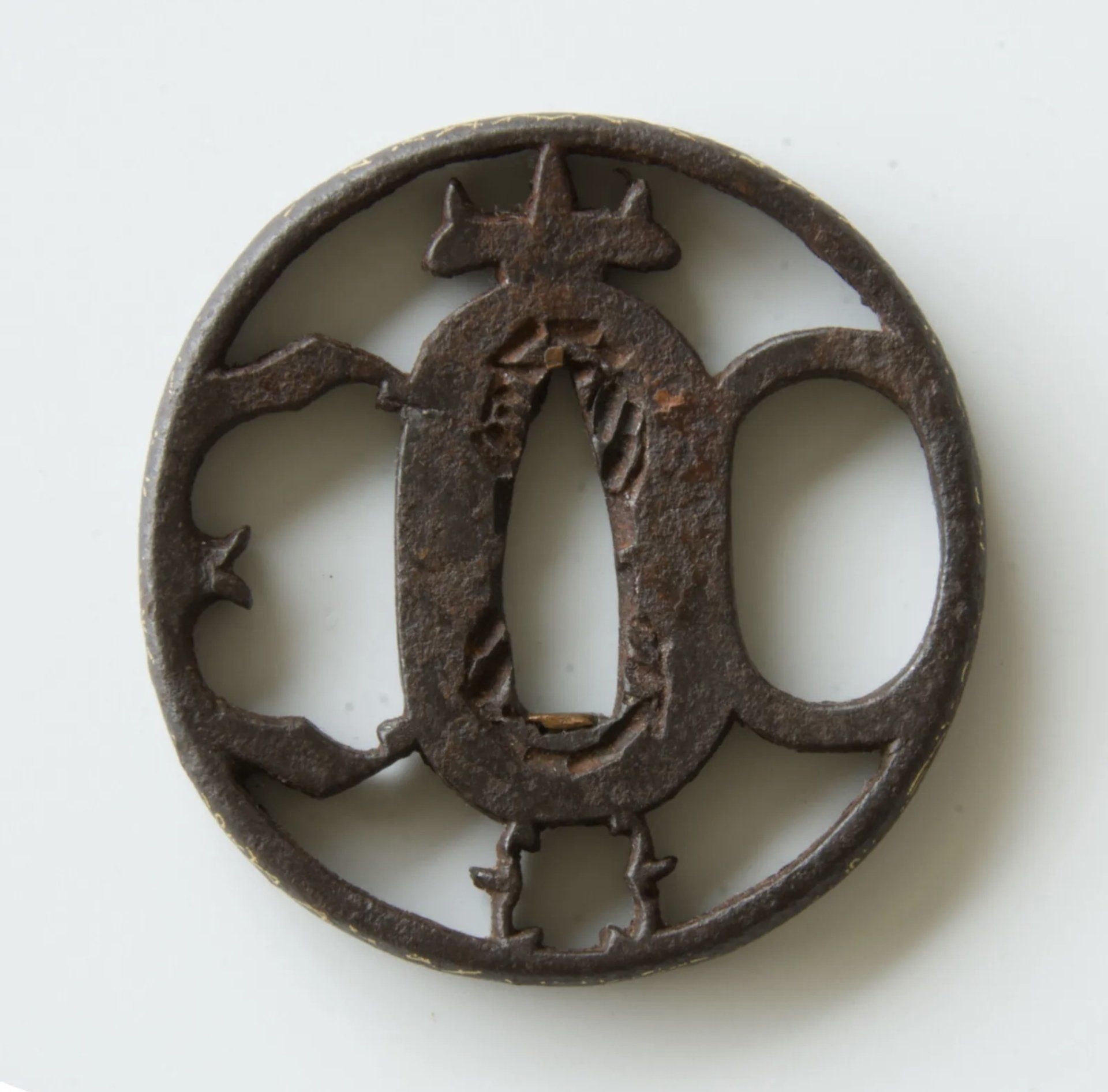 The Tsuba is made in "Sukashi" technique, potentially made with a chisel technique without the usage of filing - which were not available as tool by that century. The motive representing Ginger, Wild Geese,.. . The patination and color of steel is typical for these early authentic historic pieces.
